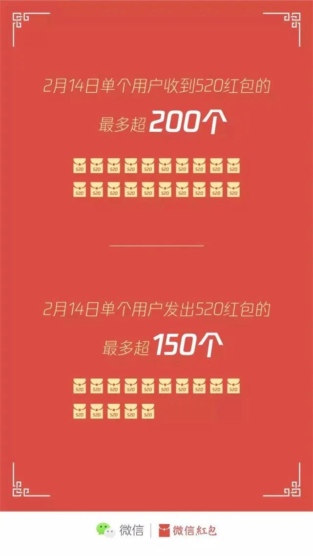 ○ 单个用户收到520红包的最多超200个,单个用户发出520红包的最多超150个(也有人收发都是……)