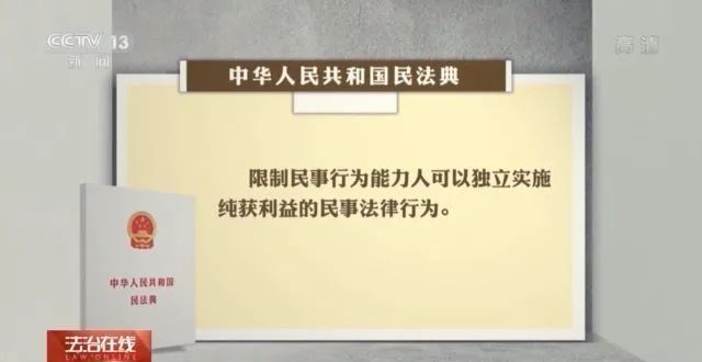 中国政法大学教授 夏吟兰: 《民法典》当中对于民事法律行为做了一个三级的规定,第一级别是完全民事行为能力人,也就是我们通常讲的成年18周岁以上;第二级别是限制民事行为能力人,规定的是8周岁以上;第三个级别就是8周岁以下,是无行为能力人,所以8周岁实际上是限制行为能力和无行为能力的一个分界线。