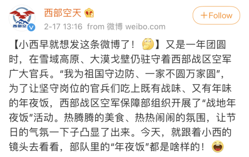 为了让大家一探究竟,2月17日,西部战区空军官方微博@西部空天 以及微信公众号投放了一波“美食炸弹”。