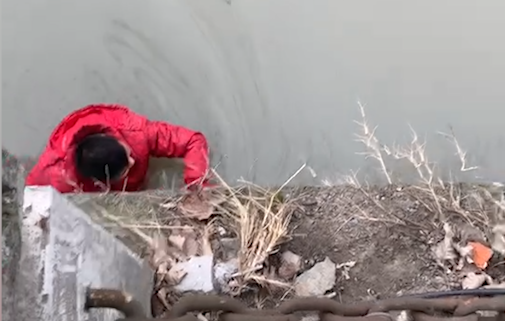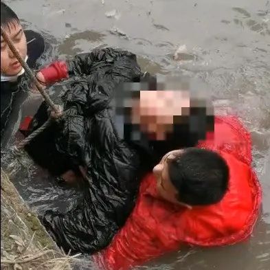 情况危急,一心救人的董乐夺来不及脱去衣物,就顺着岸边群众提供的麻绳下到冰冷刺骨的河水中。