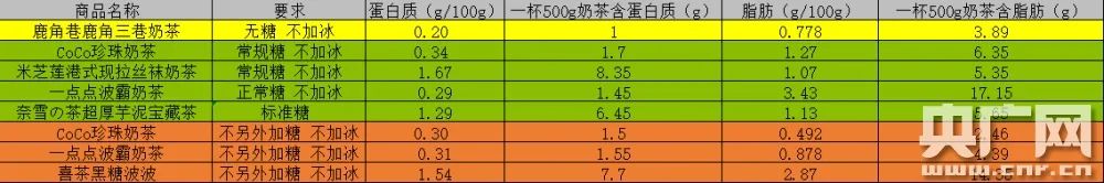 8款奶茶蛋白质、脂肪含量对比图(制图:央广网记者梁爽)