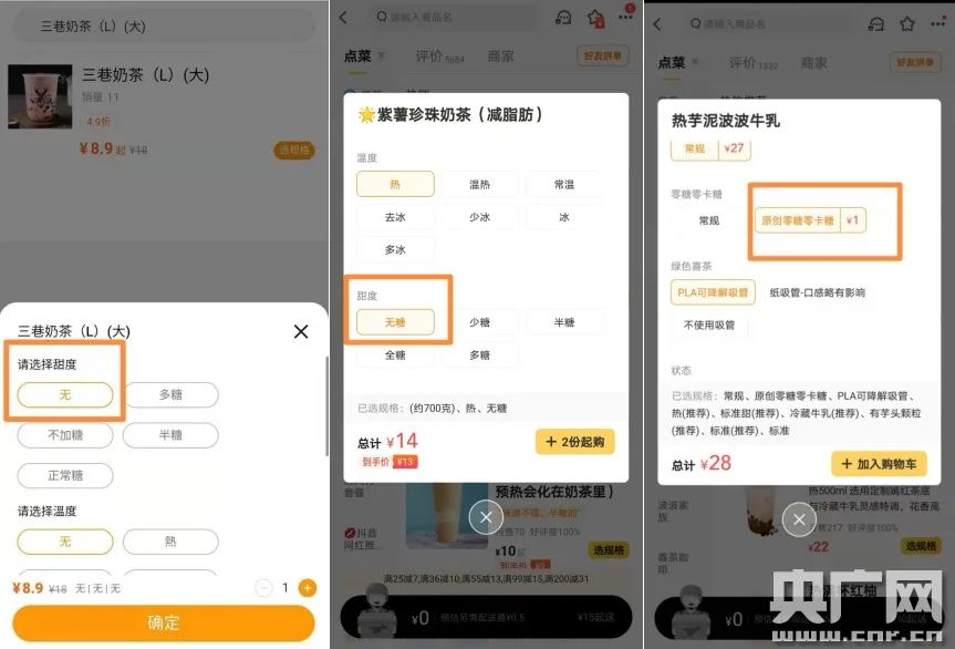 在外卖平台上,鹿角巷、CoCo都可、喜茶(顺序从左到右)均有“无糖”“零糖”选项