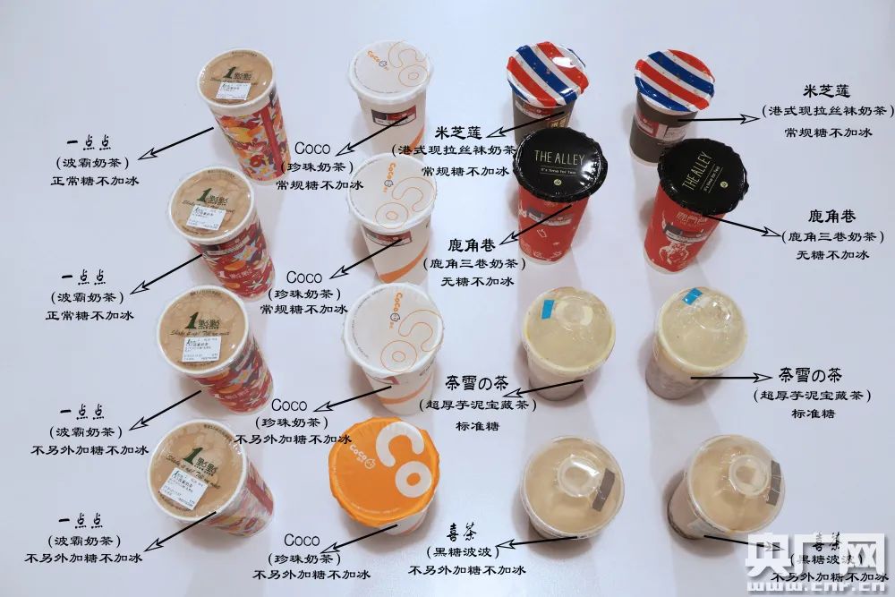 本次比较实验样本(注:奶茶中涉及的总糖、咖啡因、蛋白质、脂肪等8项指标检测结果均来自河南聚谷检测。其中,咖啡因、蛋白质指标参照北京市理化分析测试中心检测结果。本次比较实验结果仅对所购买的产品负责,不代表同品牌不同批次、不同规格产品的质量状况。)(制图:央广网记者王勇生)