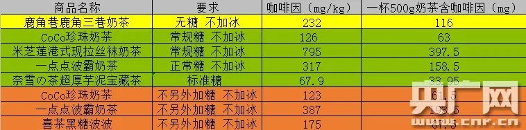 8款奶茶咖啡因含量对比图(制图:央广网记者梁爽)