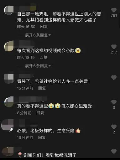 网友在评论里纷纷表示:鼻子酸了,眼泪不自觉地流了下来,每每看到这种视频就会很心酸。希望社会给老人多一点关爱。