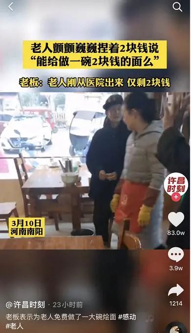 据许昌时刻消息,3 月 10 日,河南南阳,一家面馆里来了一位老人,老人拿出仅剩的两块钱,颤巍巍地对老板说:" 小伙子能不能给我下一碗两块钱的面条。",老板没有收老人的钱,免费给这位老人提供了一大碗烩面。