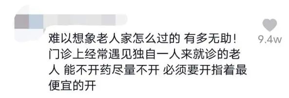 评论里有位医生分享了自己的工作经历,平时门诊时经常遇见独自来就诊的老人,能不开药尽量不开,必须开药时也会考虑老人的经济状况,开实惠的药。