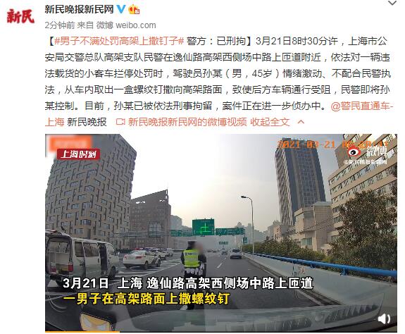 3月21日8时30分许,上海市公安局交警总队高架支队民警在逸仙路高架西侧场中路上匝道附近,依法对一辆违法载货的小客车拦停处罚时,驾驶员孙某(男,45岁)情绪激动、不配合民警执法,从车内取出一盒螺纹钉撒向高架路面,致使后方车辆通行受阻,民警即将孙某控制。目前,孙某已被依法刑事拘留,案件正在进一步侦办中。