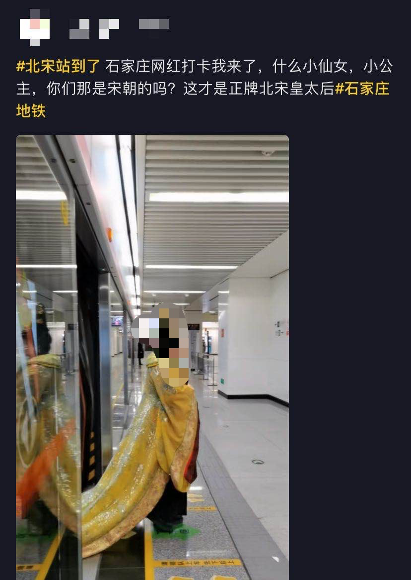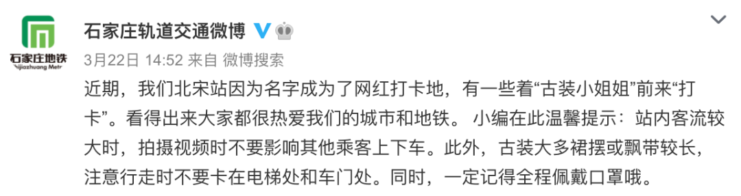 但3月22日,@石家庄轨道交通微博 发布提醒:①拍摄视频时不要影响其他乘客上下车;②古装大多裙摆或飘带较长,注意行走时不要卡在电梯处和车门处;③一定记得全程佩戴口罩哦。