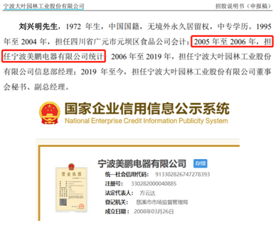 此外,根据招股书披露,刘兴明先生于2006年入职于大叶工业,目前担任公司董事会秘书、副总经理,而在此之前的2005年至2006年,担任宁波美鹏电器有限公司统计。但据《全国企业信用信息公示系统》显示,“宁波美鹏电器有限公司”成立于2008年3月。在此背景下,刘兴明先生为什么能够在2005年便担任这家公司的统计岗位?对此大叶工业并未接受记者采访。
