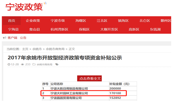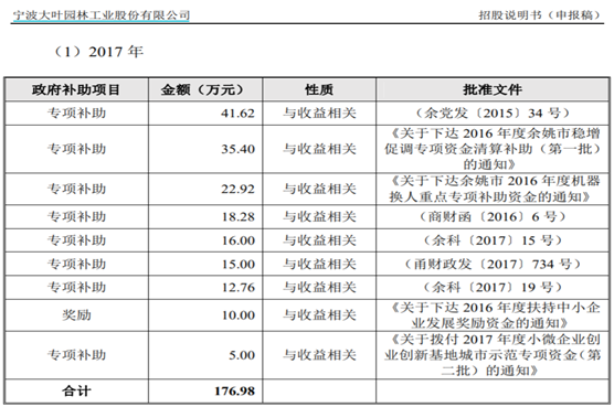根据余姚市商务局在2017年12月发布的《2017年度余姚市开放型经济专项资金补贴公示》,其中包含针对大叶工业的17.01万元补贴资金;但是招股书第423页披露的“公司获得的与日常活动相关的政府补助情况”显示,2017年并不包含单项补贴金额为17万元。