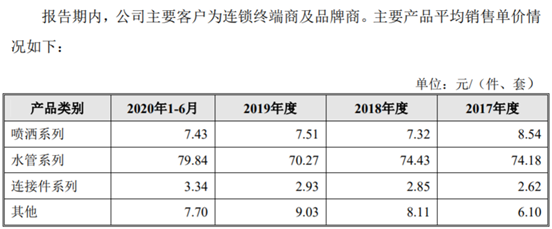 不仅如此,根据招股书页披露,2019年大叶工业的水管产品销售量为2147.71万米,同时招股书第153页披露水管系列产品2019年实现营业收入7928.05万元,由此计算公司的水管产品销售单价为3.69元/米。但在此基础上,招股书第154页披露的“主要产品平均销售单价情况”信息显示,水管系列产品的销售单价为70.27元,这与前文的数据测算结果并不相符。