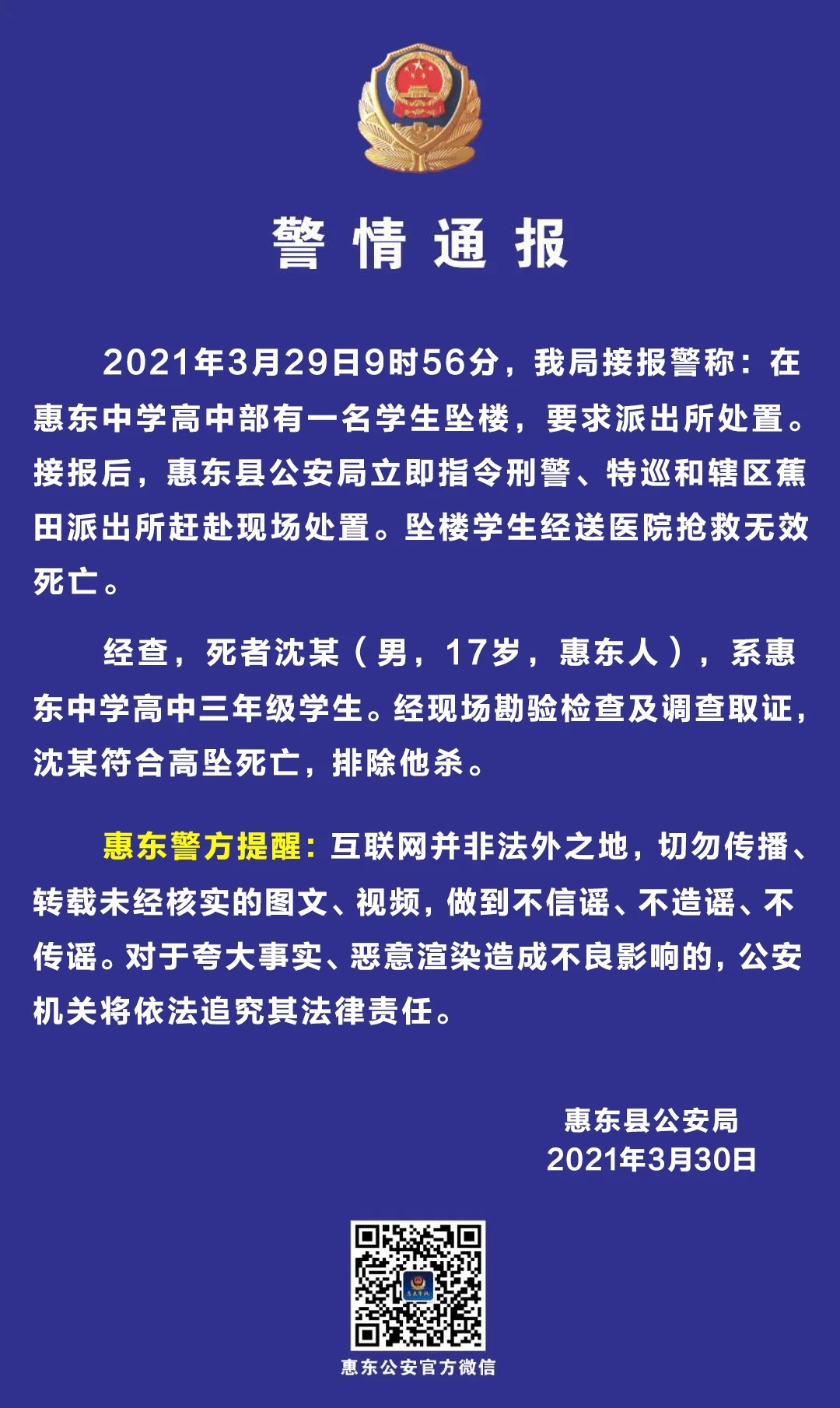 3月30日,广东省惠州市惠东县公安局官方微信公众号“惠东警讯”发布警情通报。通报提到,3月29日9时56分,惠东县公安局接报警称:在惠东中学高中部有一名学生坠楼,要求派出所处置。接报后,惠东县公安局立即指令刑警、特巡和辖区蕉田派出所赶赴现场处置。坠楼学生经送医院抢救无效死亡。