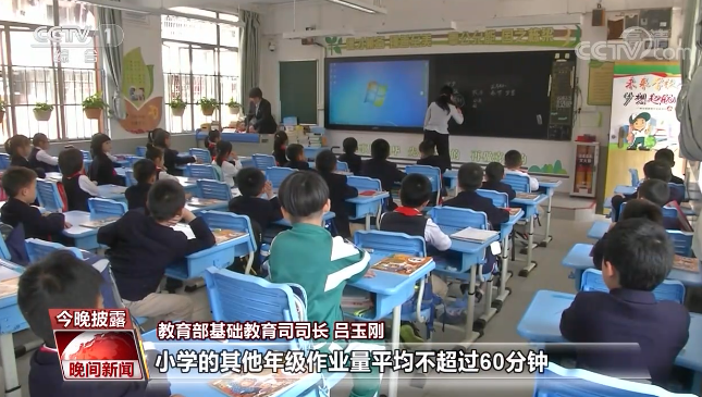 教育部基础教育司司长 吕玉刚: 小学一、二年级不留书面作业;小学的其他年级,作业量平均不超过60分钟;初中每天平均不超过90分钟。避免留一些机械性、重复性的作业,更不应该留一些惩罚性的作业。