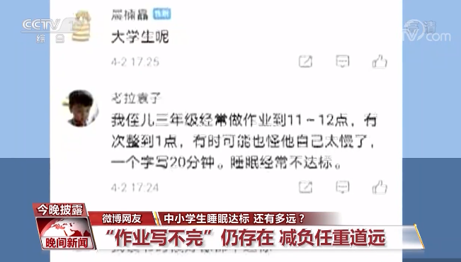 通过央视新闻网友的评论不难发现,孩子睡得晚,主要是因为课业负担重。有三年级的小学生作业要做到晚上十点甚至十一二点,有的说要睡满六小时都是奢侈。看来,根据目前的学业情况,距离睡眠达标,还有不小的距离。
