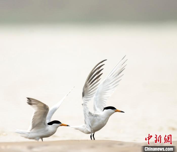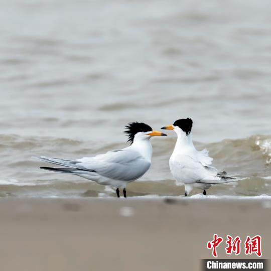 镜头里,两只中华凤头燕鸥共浴爱河,在水边洗澡、嬉闹,雄鸟绕着雌鸟转圈圈,双方跳着爱的华尔兹。黄学鼎告诉记者,这两只刚刚光临闽江口湿地的中华凤头燕鸥,“头发非常漂亮,就像18岁的姑娘披着乌黑的长发。因为刚开始谈恋爱,打扮得特别漂亮。”