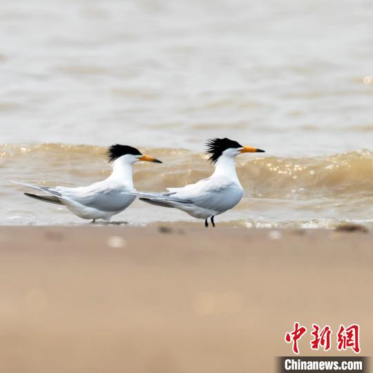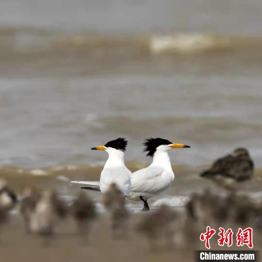 12点40分海水高潮以后,他们沿海岸线观测时,发现了两只大凤头燕鸥。以往的观鸟经验告诉他们,被称为“神话之鸟”的中华凤头燕鸥喜欢和大凤头燕鸥混群生活,二者最显著的一大区别就是中华凤头燕鸥的嘴尖是黑色的。