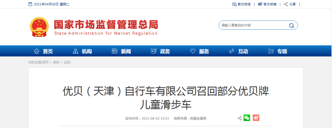 日前,优贝(天津)自行车有限公司按照《消费品召回管理暂行规定》的要求,向国家市场监督管理总局报告了召回计划,将自即日起,召回2018年4月至2020年4月期间制造的部分优贝牌儿童滑步车,涉及数量为35000辆。