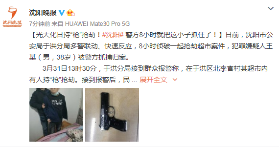 【光天化日持“枪”抢劫!#沈阳# 警方8小时就把这小子抓住了!】日前,沈阳市公安局于洪分局多警联动、快速反应,8小时侦破一起抢劫超市案件,犯罪嫌疑人王某(男,38岁)被警方抓捕归案。