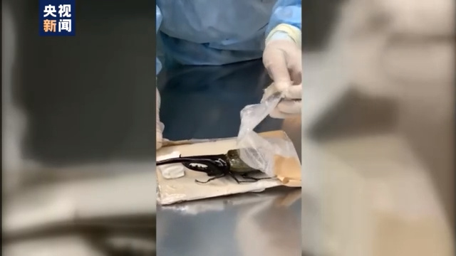 在贵阳,海关人员近日对一批进境邮件查验时,发现一个申报为杂货的邮件X光图像显示异常,疑似昆虫轮廓阴影。经开拆查验,在邮包内查获一只长19.5厘米的巨大甲虫,经过鉴定,这种甲虫名为长戟大兜虫,是世界上最大的甲虫之一,其力量极大。