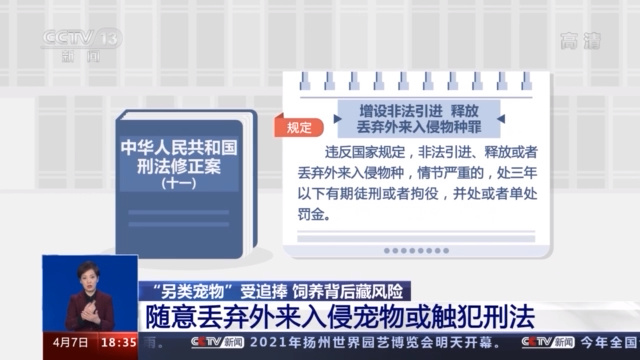 如果您将从境外购买的另类宠物随意丢弃,可能还涉嫌违法。 在刑法修正案(十一)中对此就有明确的规定。