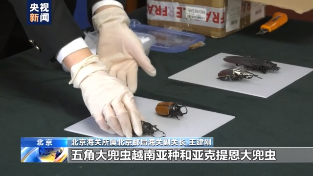 北京海关所属北京邮局海关副关长 王建刚: 经过实验室鉴定,这四个标本分别为:泰坦大天牛、歌利亚大角花金龟、五角大兜虫越南亚种和亚克提恩大兜虫,前三种均为北京口岸首次截获。