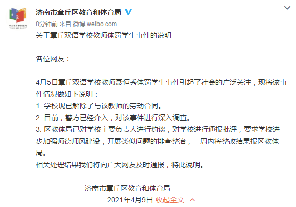 @济南市章丘区教育和体育局 微博4月9日通报,4月5日章丘双语学校教师聂某某体罚学生事件引起了社会的广泛关注,现将该事件情况做如下说明:
