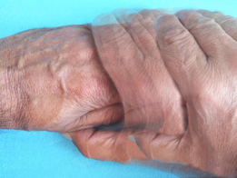 此类症状常为首发症状,大多开始于一侧上肢远端部位,静止体位时出现或症状明显,发病时拇指与屈曲的食指间呈“搓丸样”动作。