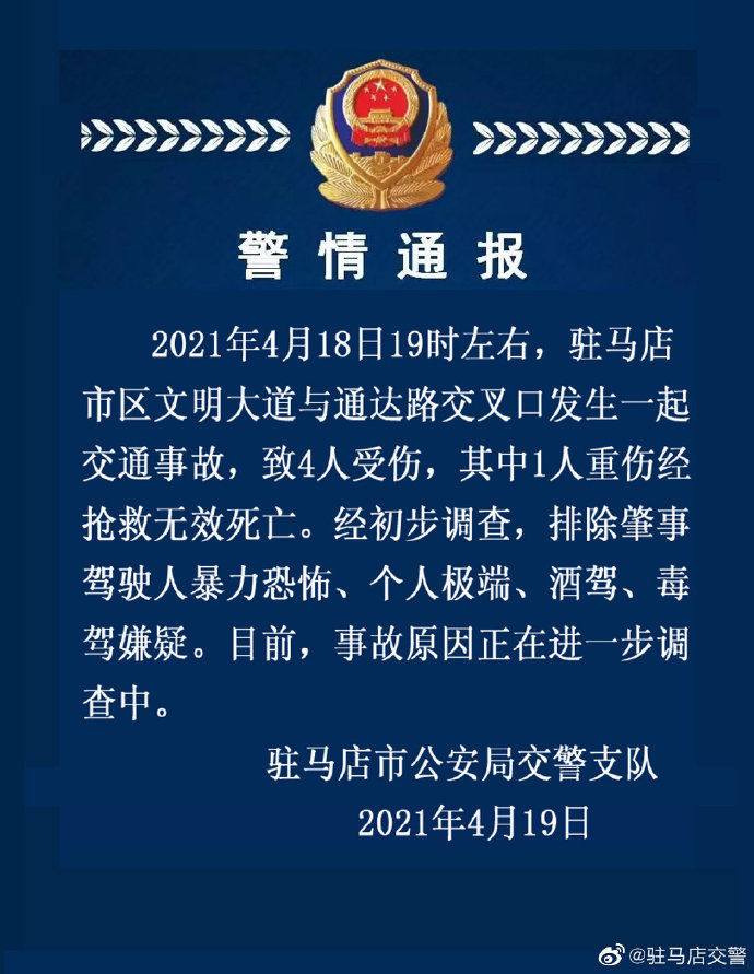 警情通报:2021年4月18日19时左右,驻马店市区文明大道与通达路交叉口发生一起交通事故,致4人受伤,其中1人重伤经抢救无效死亡。经初步调查,排除肇事驾驶人暴力恐怖、个人极端、酒驾、毒驾嫌疑。目前,事故原因正在进一步调查中。