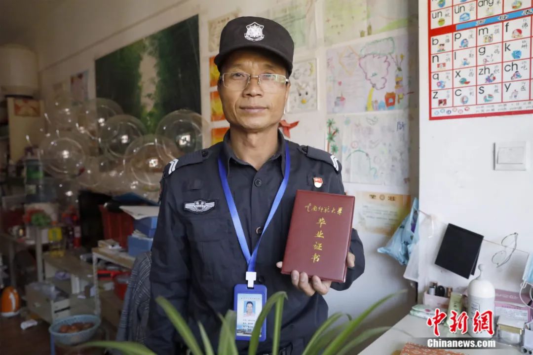 21日,记者采访保付祥才知道,原来,这位保安大叔早在2017年就靠自学通过成人高考,考上云南师范大学汉语专科。去年他已毕业,今年又开始冲刺专升本。