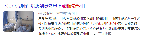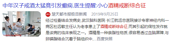 医生说,“酒精戒断综合征”是一种依赖症,道理与毒品上瘾一样,常出现在有长期饮酒史的患者身上。由于对酒精已经形成精神依赖,一旦停止饮用或骤然减量,会出现双手震颤、自主神经功能紊乱症状,如失眠、焦虑、恐慌、脉搏和呼吸加快,加重后会导致幻听或过激行为。