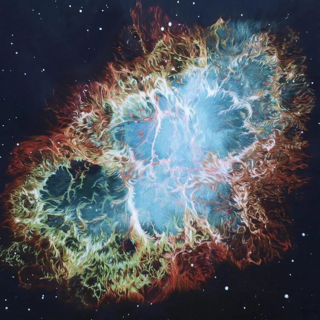 历时两年多,陈英华用10多种针法,创作出星空系列的《蟹状星云》《狮子座流星雨》等16幅“星空系列”作品。上万种颜色和针线互相交织,让这些刺绣仿佛摄影作品。