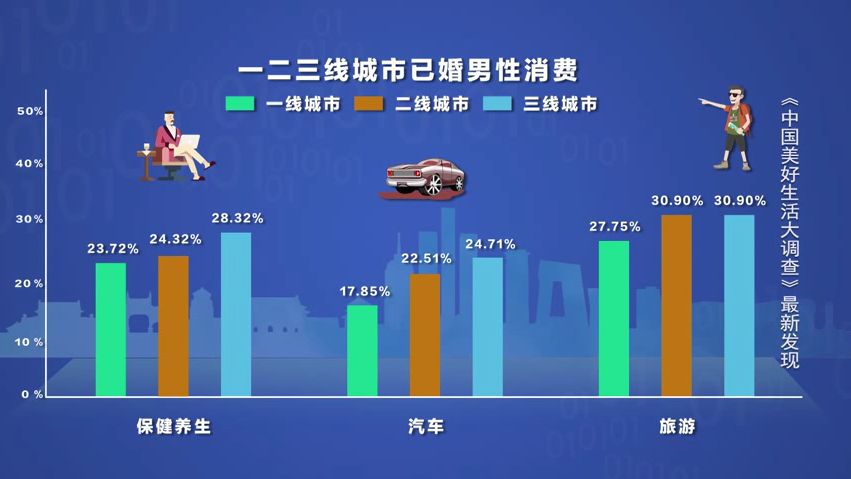 而二三线城市的已婚男人在保健养生、汽车和旅游上的支出要明显高于一线城市,相比之下一线城市的已婚男压力更大,求安顿却比较没生活。