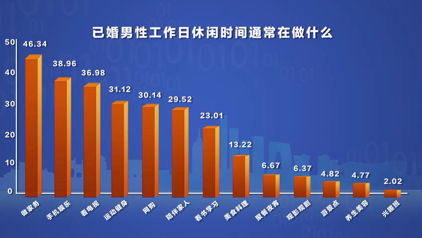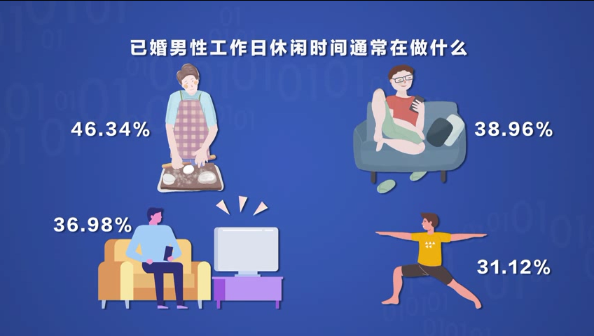 一天里的休闲时光,已婚男人又会选择做什么呢?大调查发现,在“家庭”和“自我”之间,已婚男人“端水”艺术已经修炼得炉火纯青:有将近一半的已婚男人愿意在这个时间里承担家务的琐碎,有38.96%的已婚男人表示只想自己“静静”刷刷手机,还有36.98%的人选择通过电视观察世界,也有31.12%的人愿意在大汗淋漓中体验人生。