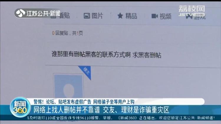 南京市民王女士有一个自己喜欢的偶像。4月中旬,有人在网上发布了一篇有关这位偶像的负面言论,王女士看了以后非常生气,就想找人把这篇帖子给删了。可忙活到最后,那篇帖子不但没有被删除,王女士自己还被骗走了八千两百块钱。这是怎么回事呢?