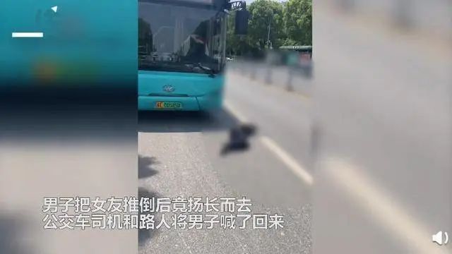 男子把女友推倒后竟扬长而去,公交车司机和路人将男子喊了回来。