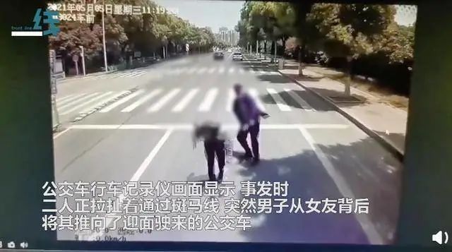5月5日,江苏苏州一名男子和女友吵架后,故意将女子推向了正在行驶的公交车。公交车行车记录仪画面显示,事发时,二人正拉扯着通过斑马线,突然男子从女友背后推着女友,一把将女友推向了迎面驶来的公交车。