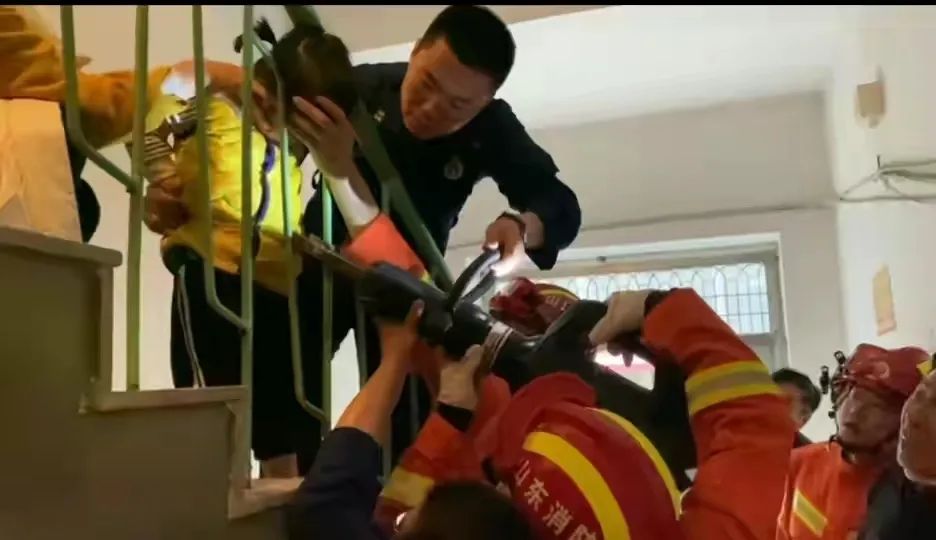 大队立即调派两辆抢险救援消防车、14名消防指战员紧急赶赴现场。指战员到达现场后发现,小女孩头部卡在楼梯的扶手栏杆中间,无法自行逃脱。