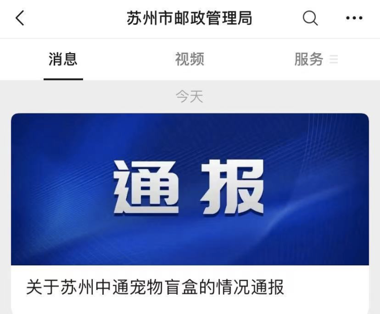 12日,苏州市邮政管理局发布通报,其中称,苏州市邮政管理局执法人员到达现场时, 发现宠物盲盒快件13件,动物已死亡。