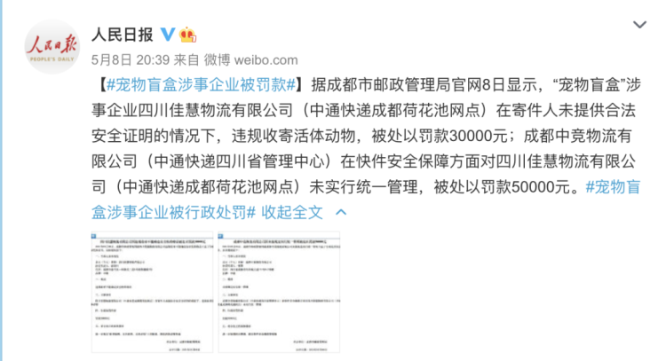 据成都市邮政管理局官网8日显示,“宠物盲盒”涉事企业被处以行政处罚↓