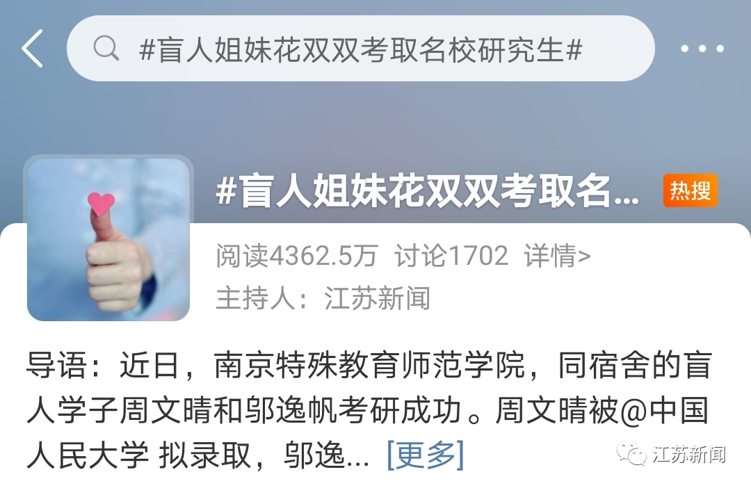 她们喜欢新鲜事物,向往未来的生活。 尽管看不见,但她们在心里给自己编织了一个五彩斑斓的世界。谈起这次考研经历,周文晴和邬逸帆深感幸运,她们希望学业完成之后,能用所学知识回报社会。