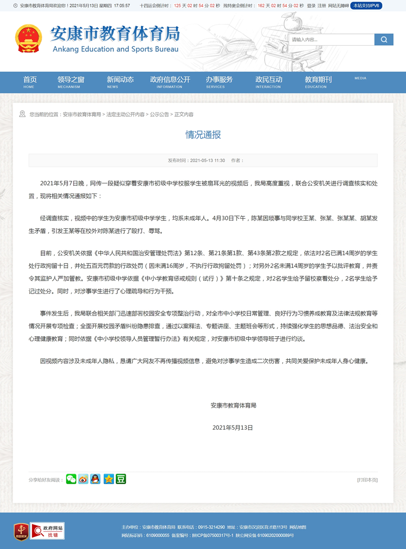 5月13日,陕西省安康市教育体育局就网传疑似穿着安康市初级中学校服学生被扇耳光视频事件发布情况通报。