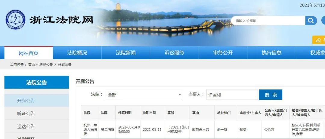据杭州市中级人民法院开庭公告,犯罪嫌疑人许国利涉嫌故意杀人一案,将于5月14日上午9点开庭。