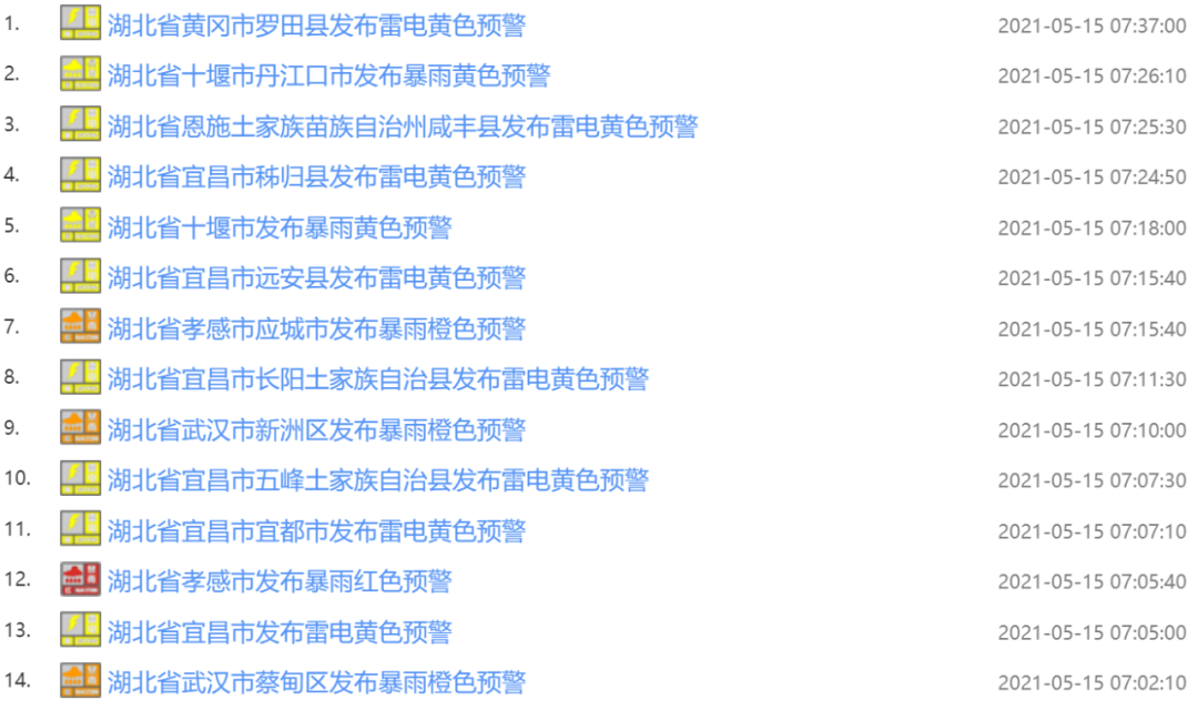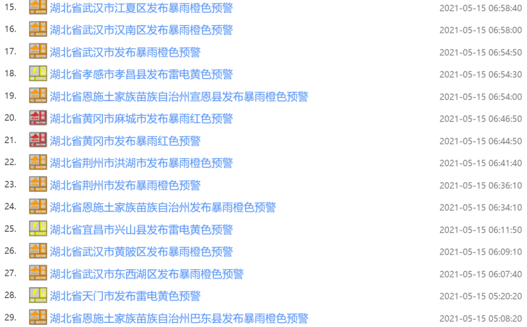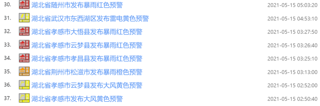 5月15日05时01分起,截至目前,湖北多地共发布37条天气预警:
