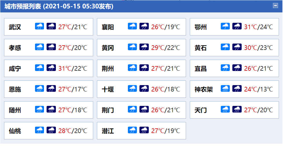 5月15日湖北省城市天气预报: