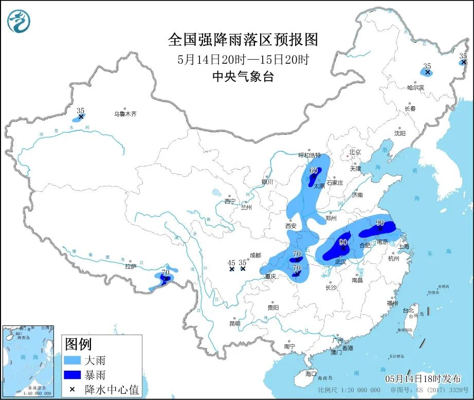 据中央气象台预计,5月14日20时至15日20时,山西、陕西东部、河南西部和南部、四川东部、重庆、湖北、安徽中北部、江苏、湖南西北部以及西藏东南部等地的部分地区有大雨, 其中,山西中北部、重庆东部、湖南西北部、湖北西南部和中东部、河南南部、安徽中部、江苏中部等地局地有暴雨。上述部分地区伴有短时强降水,小时降雨量20~40毫米,局地可达60毫米以上,局地伴有雷暴大风或冰雹等强对流天气。