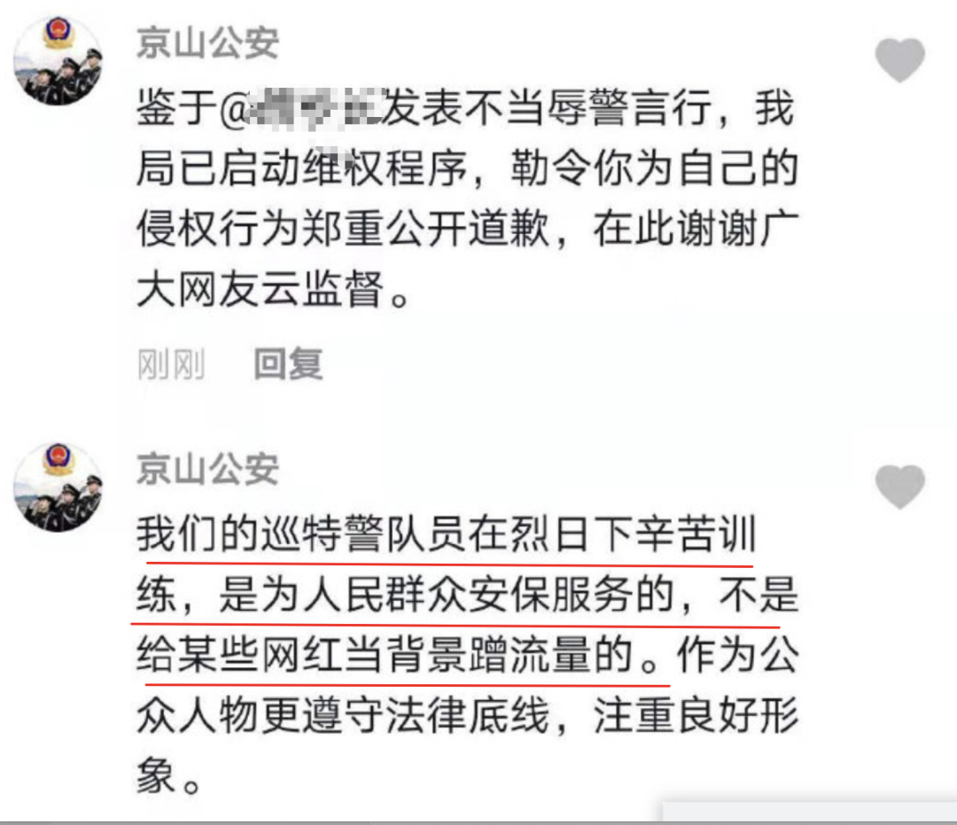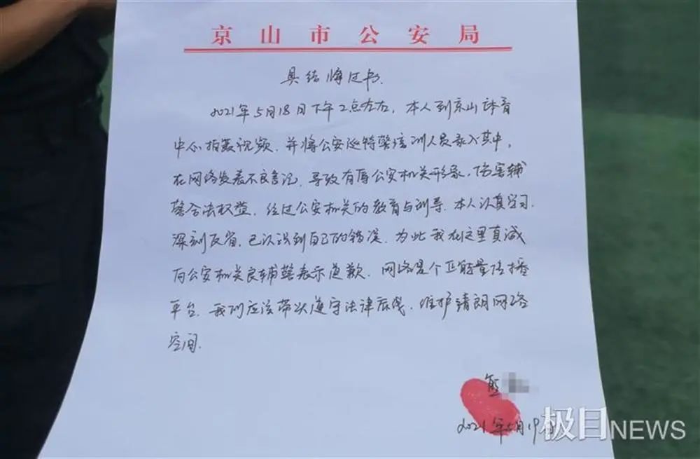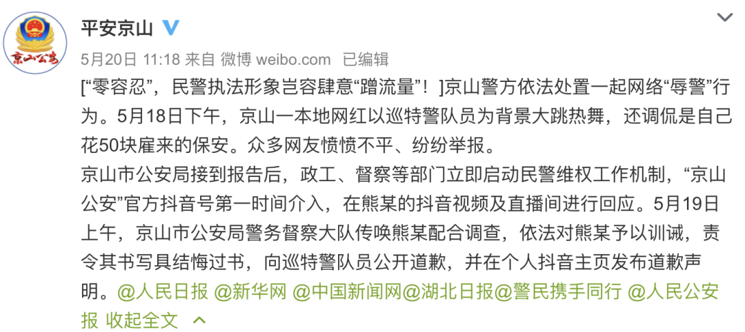 京山市公安局接到报告后,政工、督察等部门立即启动民警维权工作机制,“京山公安”官方号第一时间介入,在熊某的视频及直播间进行回应。5月19日上午,京山市公安局警务督察大队传唤熊某配合调查,依法对熊某予以训诫,责令其书写具结悔过书,