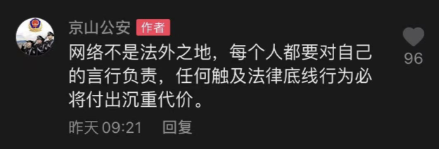 @京山公安也提醒,网络不是法外之地,每个人都要对自己的言行负责。