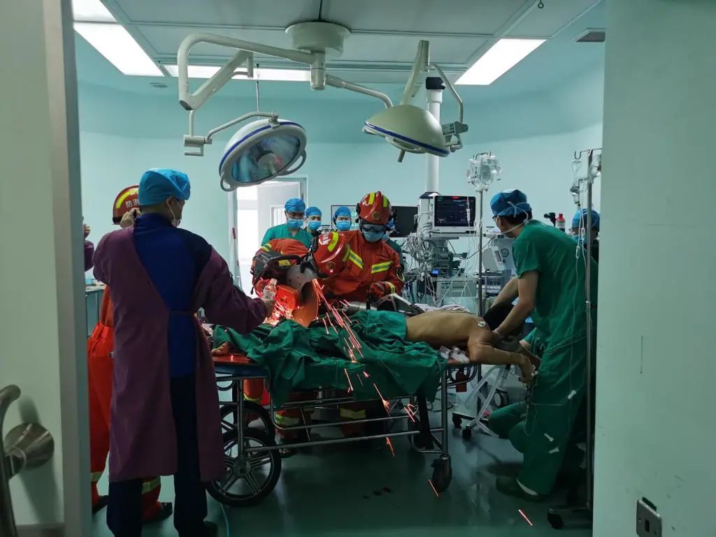 " 立即开启绿色通道!"7 点 10 分,救护车终于抵达医院急诊科,早已等待多时的抢救团队立即将病人推到急救室,询问观测病情,建快速补液扩容,连接生命监测设备。在医生引导下,消防官兵小心翼翼地将体外的钢筋锯断,确保后续抢救工作顺利进行。