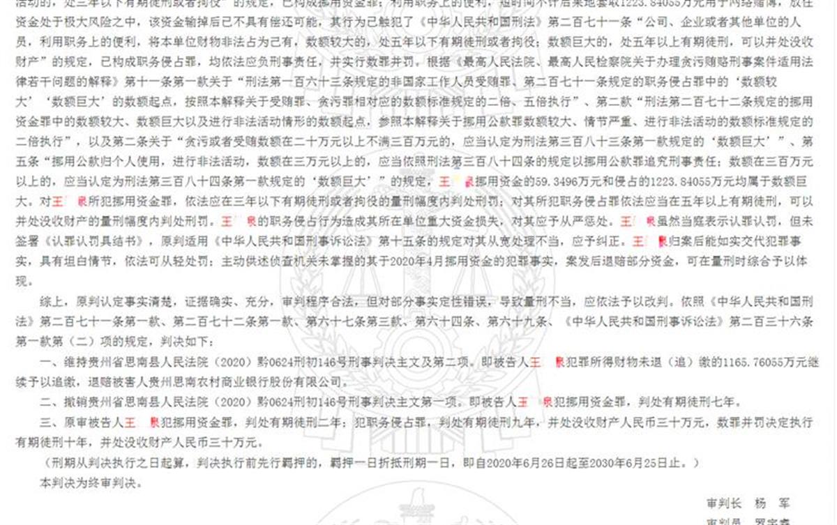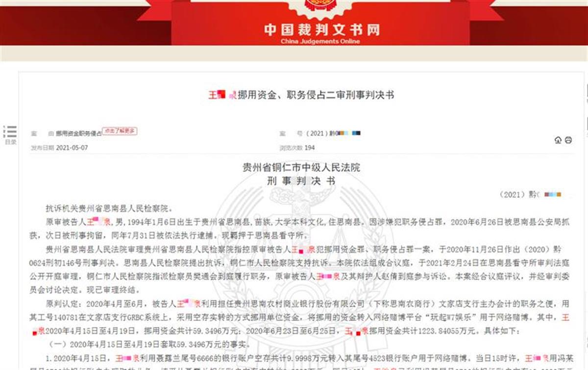 贵州思南县农村商业银行文家店支行90后会计王某泉,利用职务之便,先后套取银行1223万元用于网络赌博,其父知晓后向儿子单位告发。贵州省铜仁市中级人民法院终审判决王某泉犯挪用资金罪和职务侵占罪,数罪并罚决定执行有期徒刑十年。日前,中国裁判文书网发布了上述判决。